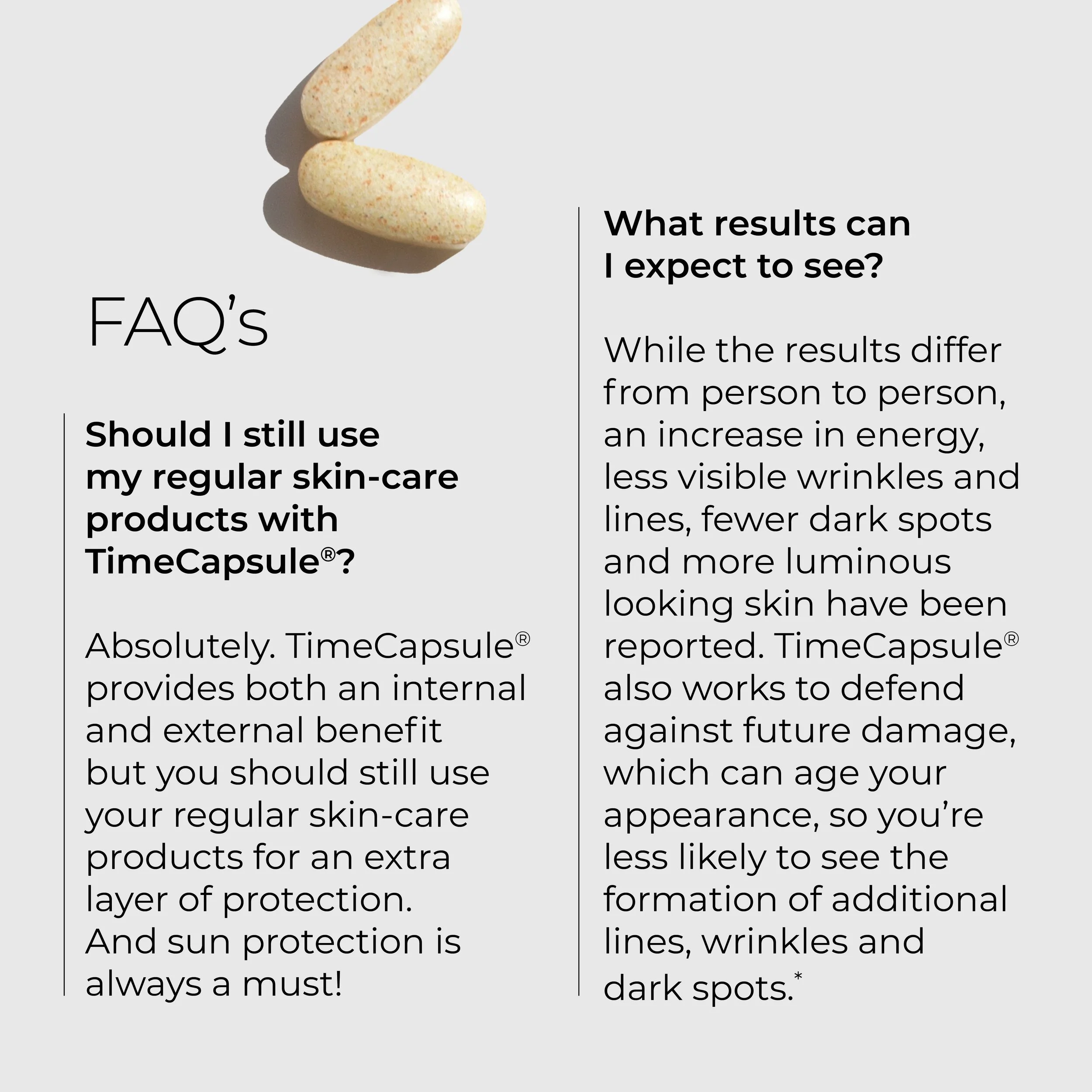 While the results differ from person to person, an increase in energy, less visible wrinkles and lines, fewer dark spots and more luminous looking skin have been reported. TimeCapsule also works to defend against future damage, which can age your appearance, so you’re less likely to see the formation of additional lines, wrinkles and dark spots.*